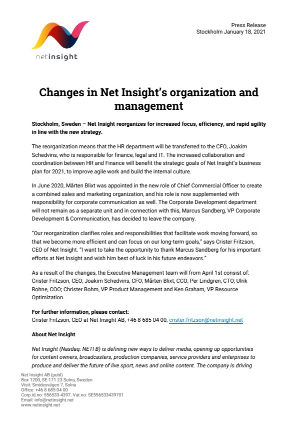 “Our reorganization clarifies roles and responsibilities that facilitate work moving forward, so that we become more efficient and can focus on our long-term goals,” says Crister Fritzson, CEO of Net Insight. “I want to take the opportunity to thank Marcus Sandberg for his important efforts at Net Insight and wish him best of luck in his future endeavors.”