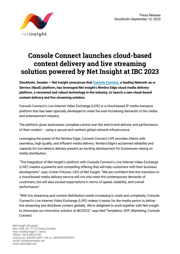 “The integration of Net Insight's platform with Console Connect’s Live Internet Video Exchange (LIVE) creates a powerful and compelling offering that will help customers with their business development,” says Crister Fritzson, CEO of Net Insight. “We are confident that this transition to a cloud-based media delivery service will not only meet the contemporary demands of customers, but will also exceed expectations in terms of speed, reliability, and overall performance.”