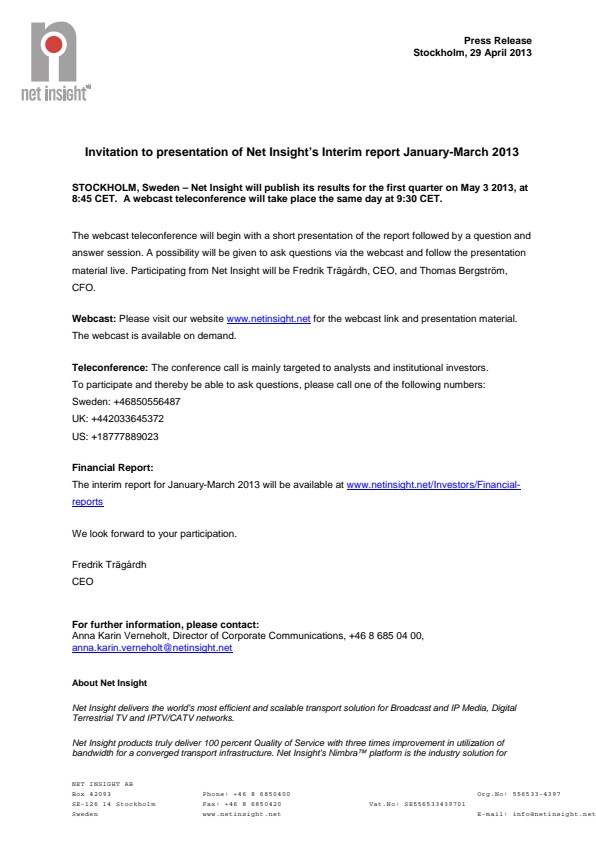 STOCKHOLM, Sweden – Net Insight will publish its results for the first quarter on May 3 2013, at 8:45 CET. A webcast teleconference will take place the same day at 9:30 CET.