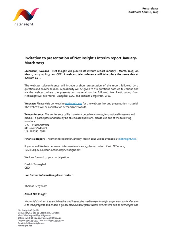 Financial Report:The interim report for January-March 2017 will be available at netinsight.net.
