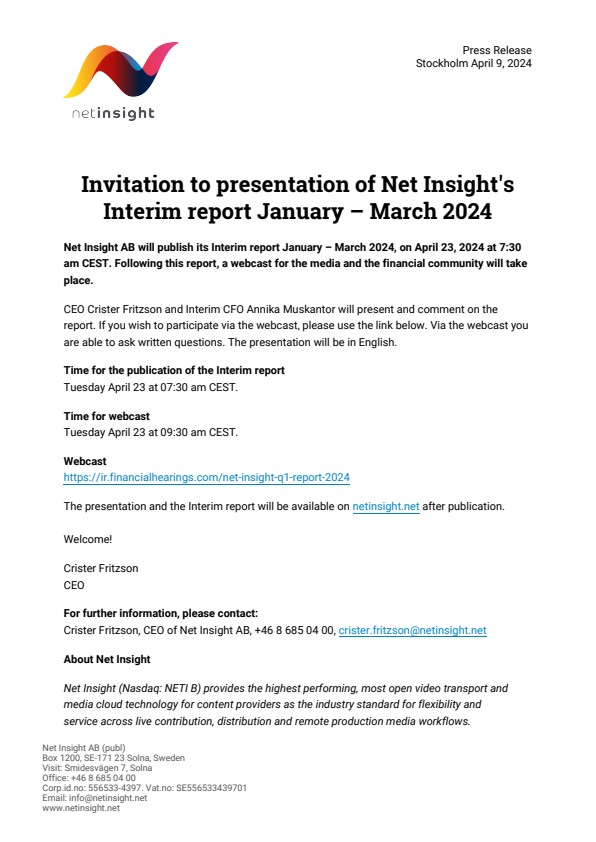 Net Insight AB will publish its Interim report January – March 2024, on April 23, 2024 at 7:30 am CEST. Following this report, a webcast for the media and the financial community will take place.