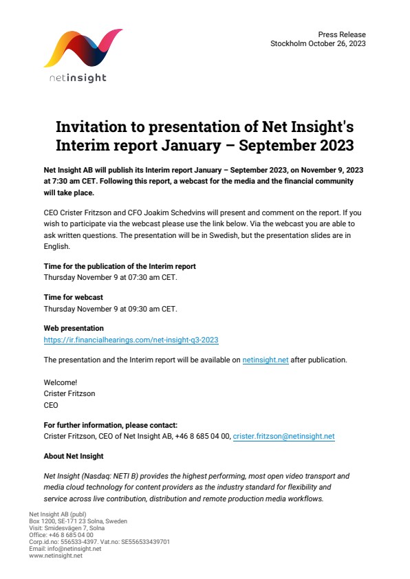 Net Insight AB will publish its Interim report January – September 2023, on November 9, 2023 at 7:30 am CET. Following this report, a webcast for the media and the financial community will take place.