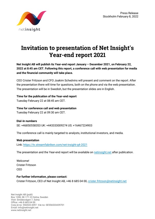 Net Insight AB will publish its Year-end report January – December 2021, on February 22, 2022 at 8:45 am CET. Following this report, a conference call with web presentation for media and the financial community will take place.