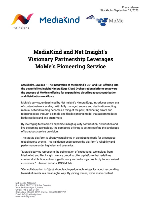 “MoMe's service represents the culmination of exceptional technology from MediaKind and Net Insight. We are proud to offer a platform that redefines content distribution, enhancing efficiency and reducing complexity for our valued customers.” –Jaime Herbada, COO MoMe.