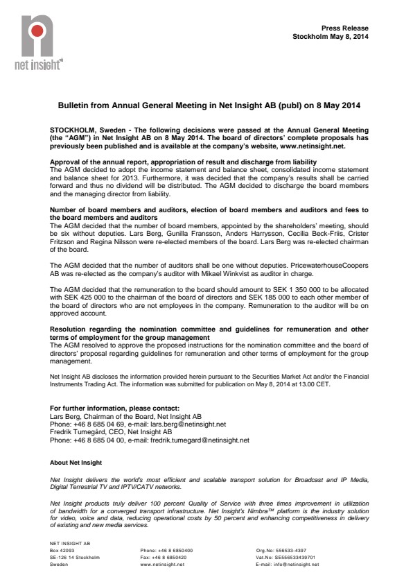 STOCKHOLM, Sweden – The following decisions were passed at the Annual General Meeting (the "AGM") in Net Insight AB on 8 May 2014. The board of directors' complete proposals has previously been published and is available at the company's website, www.netinsight.net.