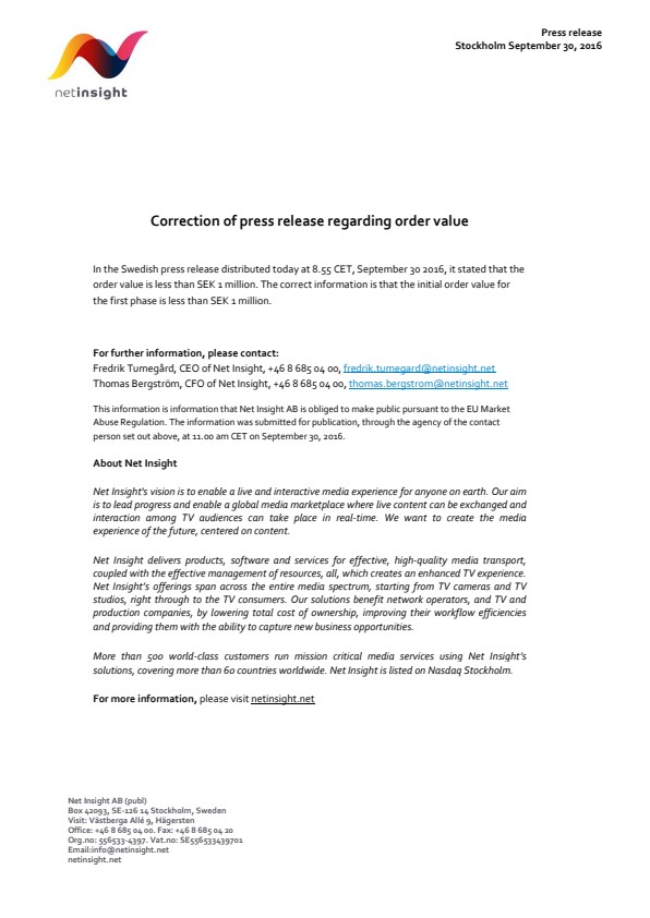 In the Swedish press release distributed today at 8.55 CET, September 30 2016, it stated that the order value is less than SEK 1 million. The correct information is that the initial order value for the first phase is less than SEK 1 million.