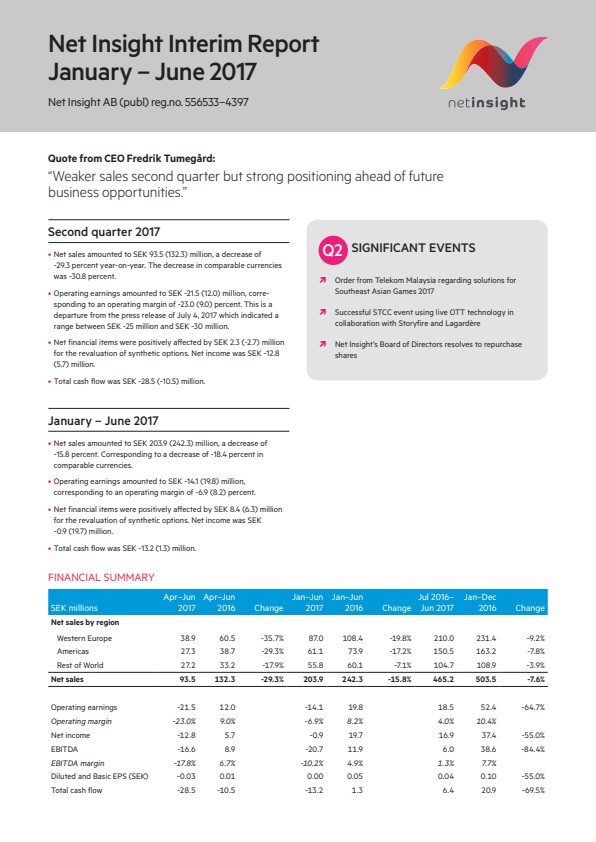 This information is information that Net Insight AB is obliged to make public pursuant to the EU Market Abuse Regulation. The information was submitted for publication, through the agency of the contact persons set out above, at 08.45 am CET on July 21, 2017.