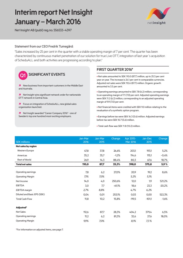 Net Insight AB discloses the information provided herein pursuant to the Securities Market Act and/or the Financial Instruments Trading Act. The information was submitted for publication on April 27, 2016 at 09.05 am CET.