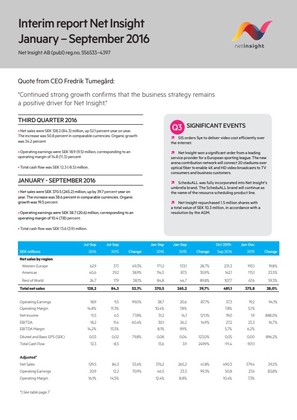Net Insight Interim report January – September 2016