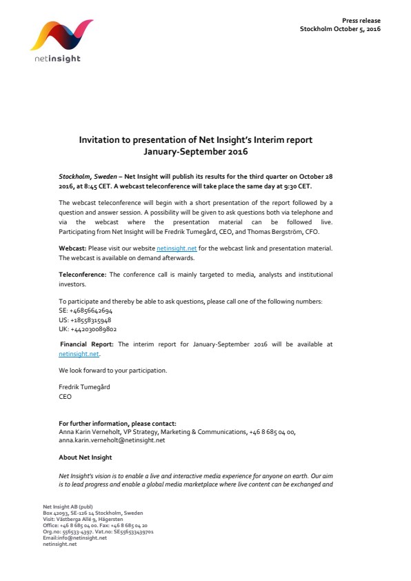 Financial Report: The interim report for January-September 2016 will be available at netinsight.net.