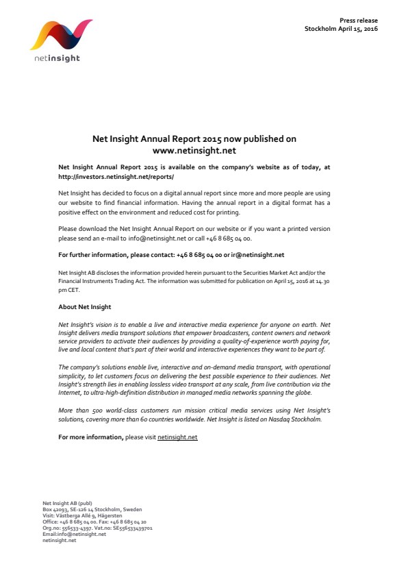 Net Insight Annual Report 2015 is available on the company's website as of today, at http://investors.netinsight.net/reports/
