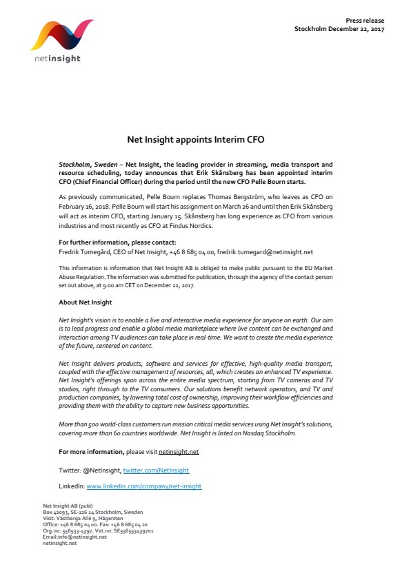 This information is information that Net Insight AB is obliged to make public pursuant to the EU Market Abuse Regulation. The information was submitted for publication, through the agency of the contact person set out above, at 9.00 am CET on December 22, 2017.