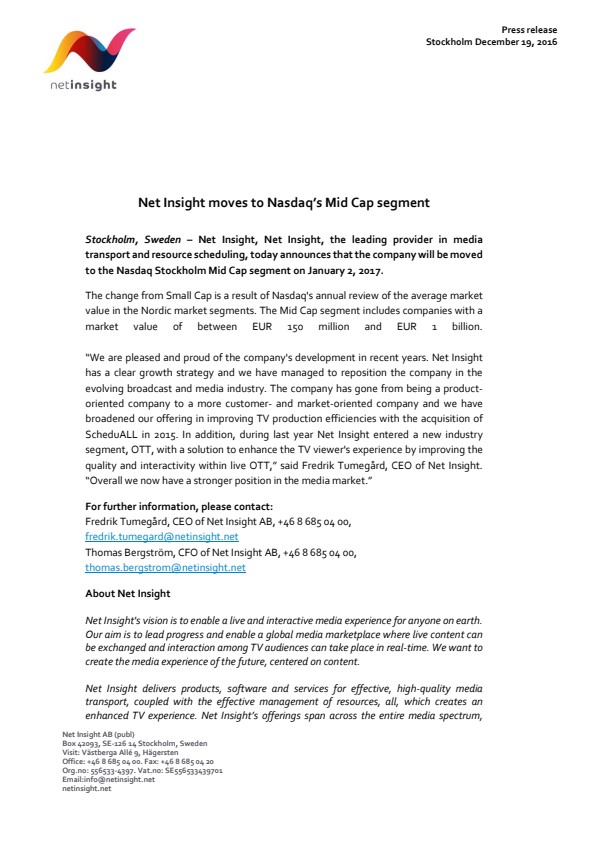 Stockholm, Sweden – Net Insight, Net Insight, the leading providerin media transport and resource scheduling, today announces that the company will be moved to the Nasdaq Stockholm Mid Cap segment on January 2, 2017.