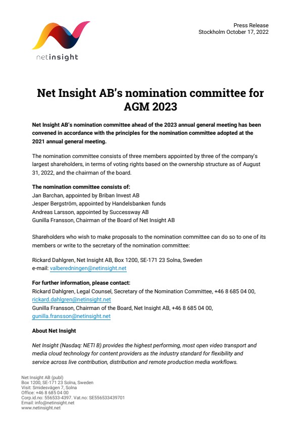 Net Insight AB’s nomination committee ahead of the 2023 annual general meeting has been convened in accordance with the principles for the nomination committee adopted at the 2021 annual general meeting.