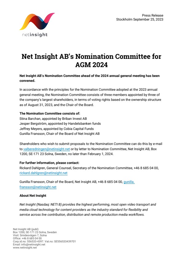 Shareholders who wish to submit proposals to the Nomination Committee can do this by e-mail to valberedningen@netinsight.net or by letter to Nomination Committee, Net Insight AB, Box 1200, SE-171 23 Solna, Sweden, no later than February 1, 2024.