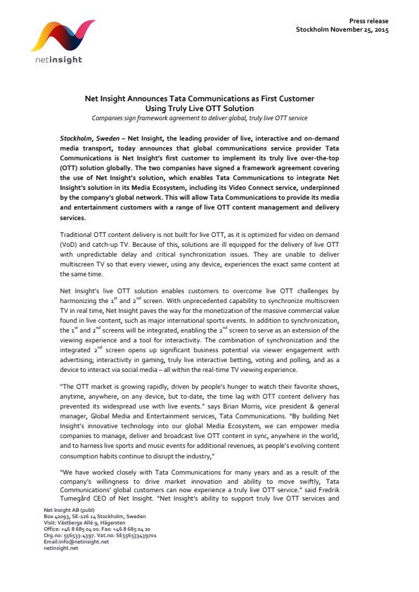 Stockholm, Sweden – Net Insight, the leading provider of live, interactive and on-demand media transport, today announces that global communications service provider Tata Communications is Net Insight's first customer to implement its truly live over-the-top (OTT) solution globally. The two companies have signed a framework agreement covering the use of Net Insight's solution, which enables Tata Communications to integrate Net Insight's solution in its Media Ecosystem, including its Video Connect service, underpinned by the company's global network. This will allow Tata Communications to provide its media and entertainment customers with a range of live OTT content management and delivery services.