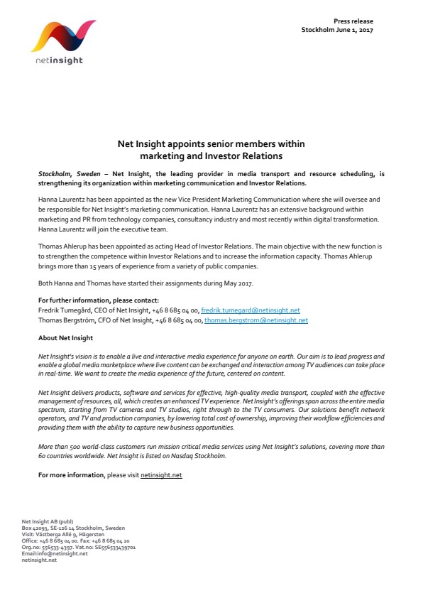 Stockholm, Sweden –Net Insight, the leading providerin media transport and resource scheduling, is strengthening its organization within marketing communication and Investor Relations.