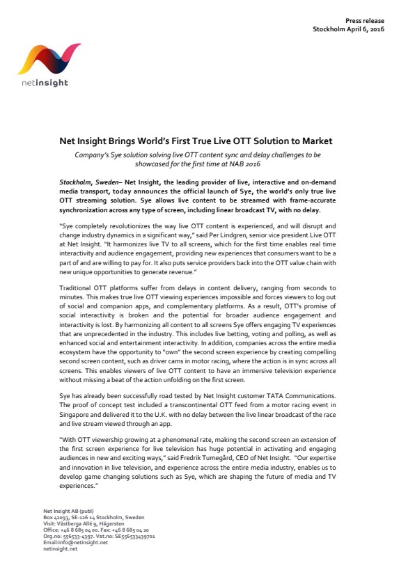 "With OTT viewership growing at a phenomenal rate, making the second screen an extension of the first screen experience for live television has huge potential in activating and engaging audiences in new and exciting ways," said Fredrik Tumegård, CEO of Net Insight. "Our expertise and innovation in live television, and experience across the entire media industry, enables us to develop game changing solutions such as Sye, which are shaping the future of media and TV experiences."