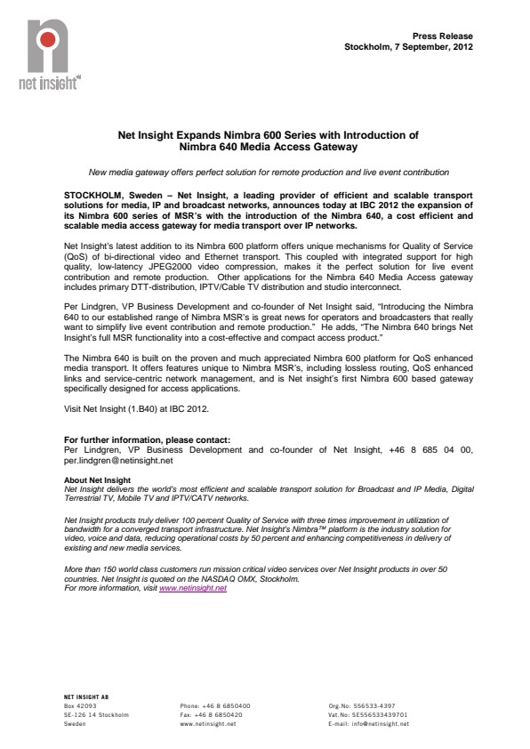 STOCKHOLM, Sweden – Net Insight, a leading provider of efficient and scalable transport solutions for media, IP and broadcast networks, announces today at IBC 2012 the expansion of its Nimbra 600 series of MSR's with the introduction of the Nimbra 640, a cost efficient and scalable media access gateway for media transport over IP networks.