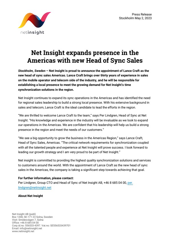 “We see a big opportunity to grow the business in the Americas Region,” says Lance Craft, Head of Sync Sales, Americas. “The critical network requirements for synchronization coupled with all the talented people and experience at Net Insight will prove success. I look forward to leading our growth strategy and I am very proud to be part of Net Insight.”