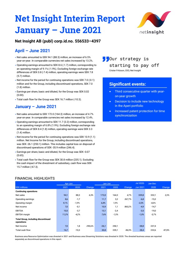 Crister Fritzson, CEO of Net Insight AB, +46 8 685 04 00, crister.fritzson@netinsight.net