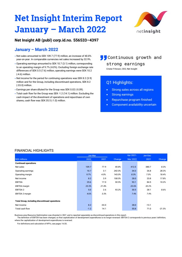 Net Insight Interim Report January – March 2022