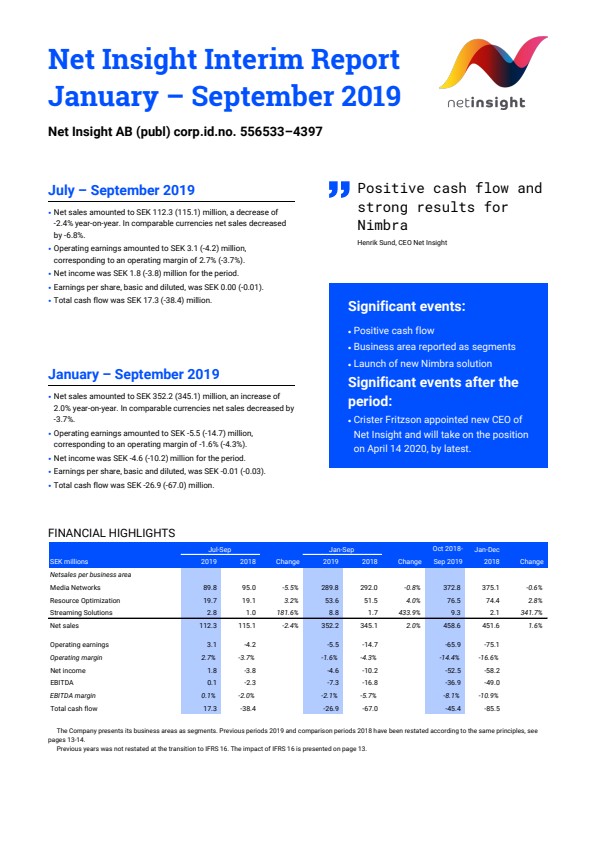 Net Insight Interim Report January – September 2019