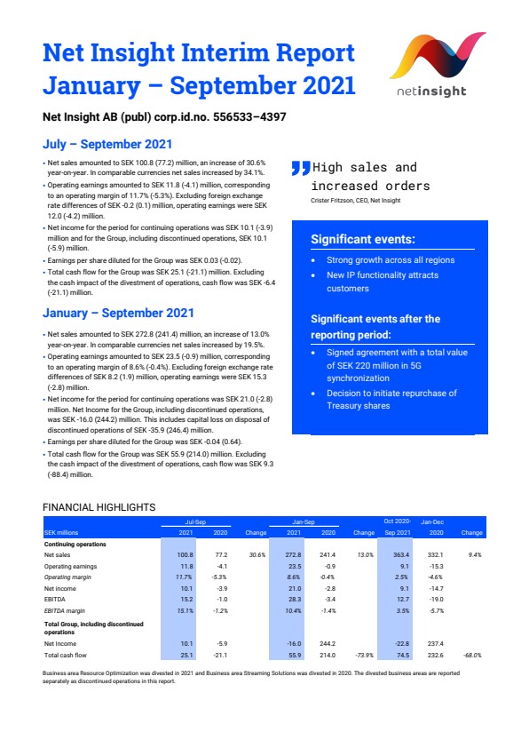 Net Insight Interim Report January – September 2021