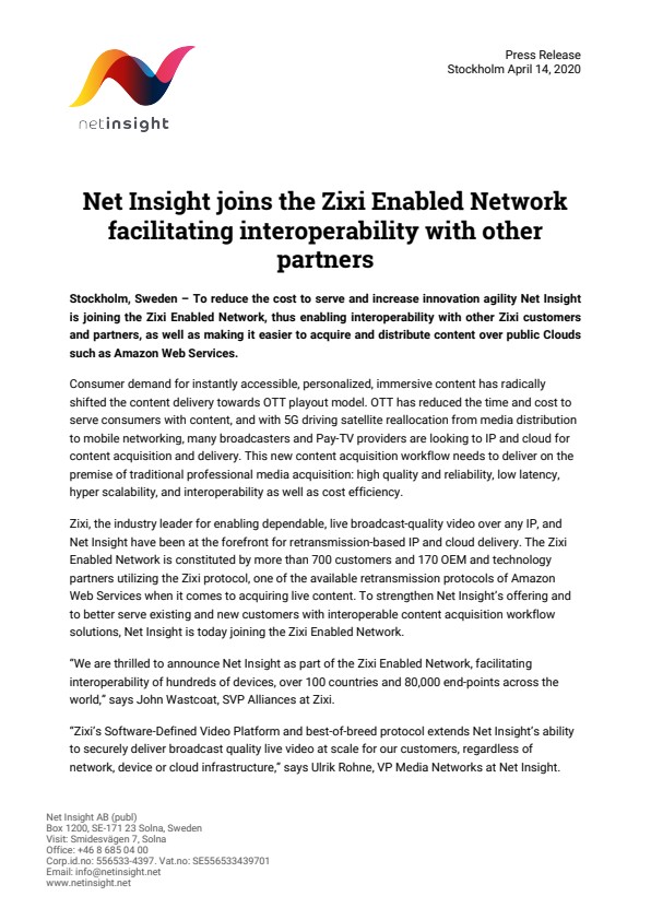 “We are thrilled to announce Net Insight as part of the Zixi Enabled Network, facilitating interoperability