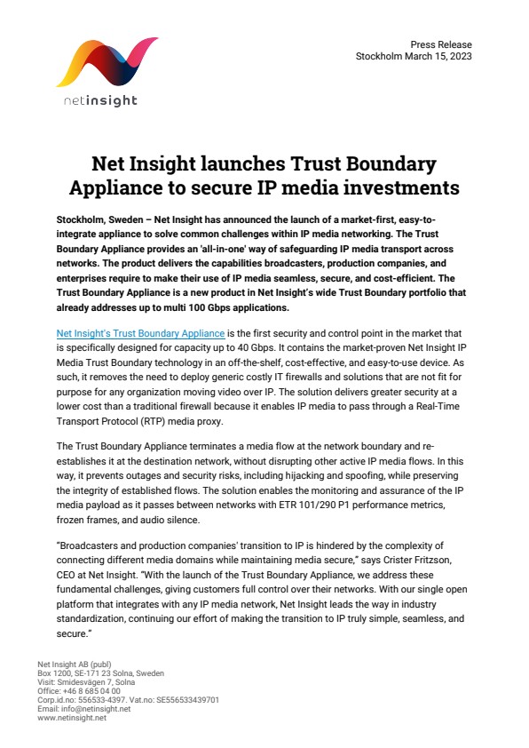 Stockholm, Sweden – Net Insight has announced the launch of a market-first, easy-to-integrate appliance to solve common challenges within IP media networking. The Trust Boundary Appliance provides an 'all-in-one' way of safeguarding IP media transport across networks. The product delivers the capabilities broadcasters, production companies, and enterprises require to make their use of IP media seamless, secure, and cost-efficient. The Trust Boundary Appliance is a new product in Net Insight’s wide Trust Boundary portfolio that already addresses up to multi 100 Gbps applications.