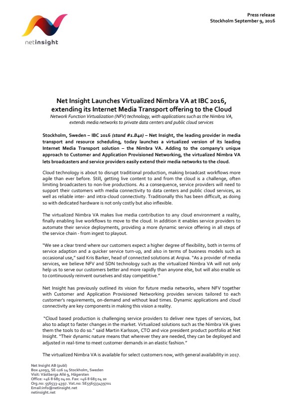 Stockholm, Sweden – IBC 2016 (stand #1.B40) – Net Insight,the leading providerin media transport and resource scheduling, today launches a virtualized version of its leading Internet Media Transport solution – the Nimbra VA. Adding to the company's unique approach to Customer and Application Provisioned Networking, the virtualized Nimbra VA lets broadcasters and serviceproviders easily extend their media networks to the cloud.