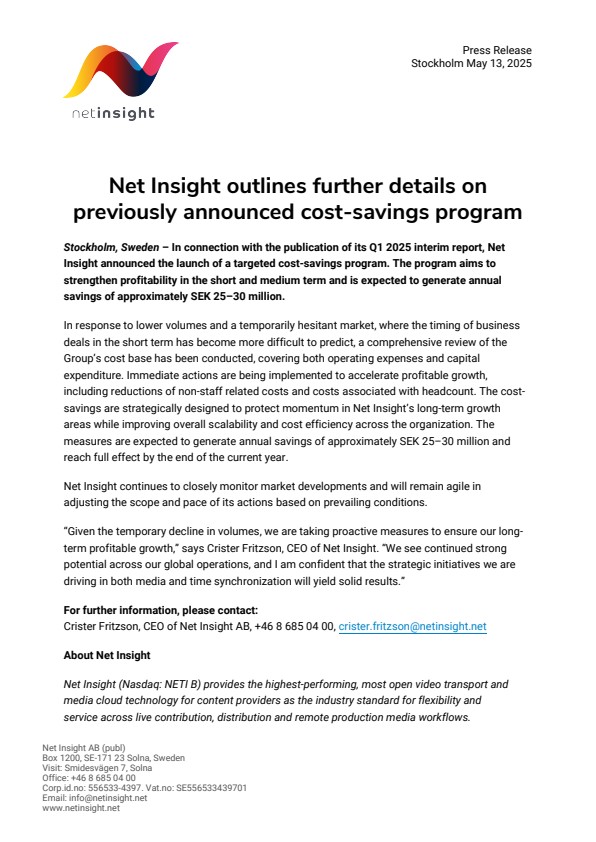 Stockholm, Sweden – In connection with the publication of its Q1 2025 interim report, Net Insight announced the launch of a targeted cost-savings program. The program aims to strengthen profitability in the short and medium term and is expected to generate annual savings of approximately SEK 25–30 million.