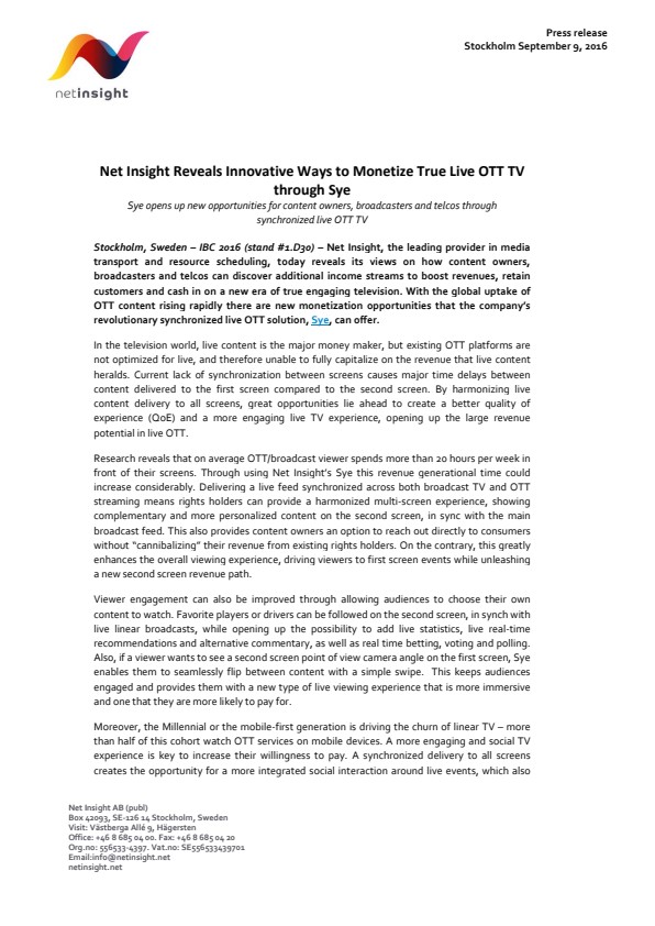 Stockholm, Sweden – IBC 2016 (stand #1.D30) – Net Insight, the leading provider in media transport and resource scheduling, today reveals its views on howcontent owners, broadcasters and telcos can discover additional income streams to boost revenues, retain customers andcash in on a new era of true engaging television.With the global uptake of OTT content rising rapidly there are new monetization opportunities that the company's revolutionary synchronized live OTT solution, Sye, can offer.