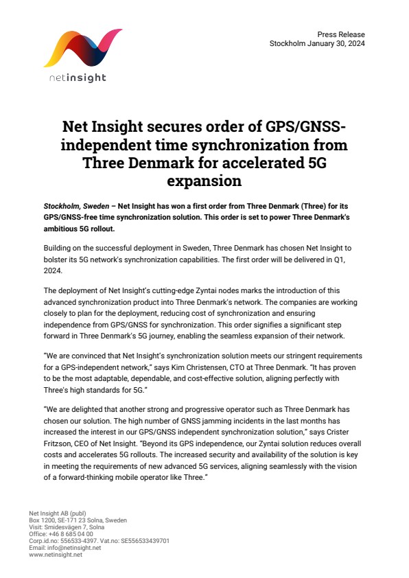 “We are delighted that another strong and progressive operator such as Three Denmark has chosen our solution. The high number of GNSS jamming incidents in the last months has increased the interest in our GPS/GNSS independent synchronization solution,” says Crister Fritzson, CEO of Net Insight. “Beyond its GPS independence, our Zyntai solution reduces overall costs and accelerates 5G rollouts. The increased security and availability of the solution is key in meeting the requirements of new advanced 5G services, aligning seamlessly with the vision of a forward-thinking mobile operator like Three.”