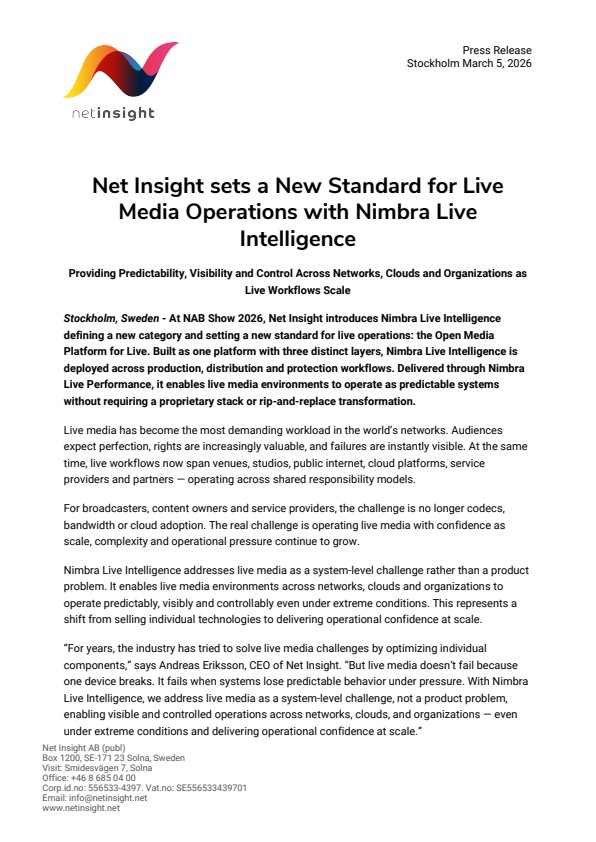 Net Insight will showcase Nimbra Live Intelligence and the Open Media Platform for Live at NAB Show 2026. Please book a meeting and visit Net Insight’s booth W1653 on April 19-22, 2026. Explore Net Insight’s NAB Campaign here.