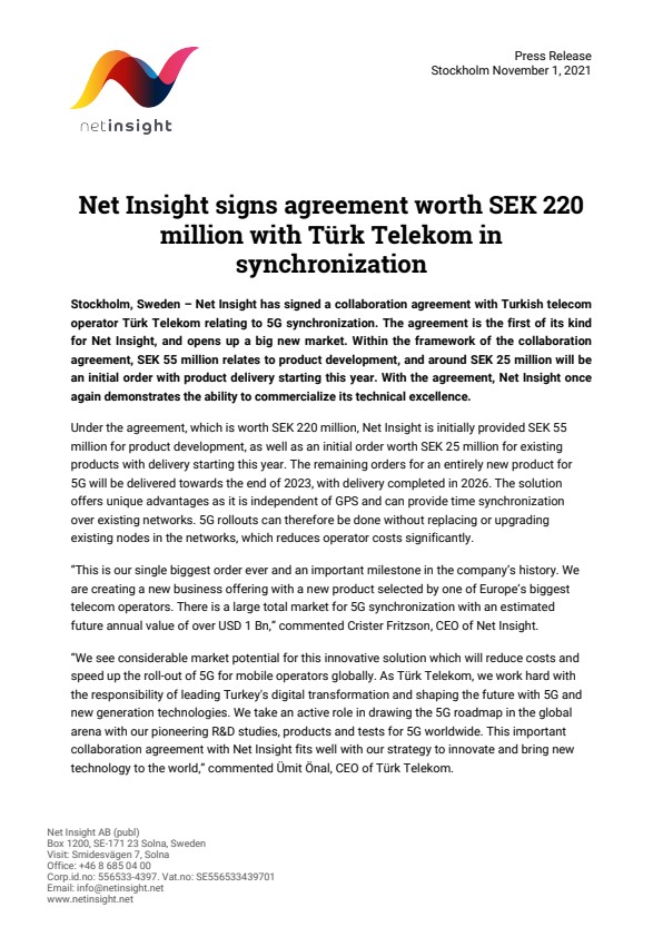 Stockholm, Sweden – Net Insight has signed a collaboration agreement with Turkish telecom operator Türk Telekom relating to 5G synchronization. The agreement is the first of its kind for Net Insight, and opens up a big new market. Within the framework of the collaboration agreement, SEK 55 million relates to product development, and around SEK 25 million will be an initial order with product delivery starting this year. With the agreement, Net Insight once again demonstrates the ability to commercialize its technical excellence.