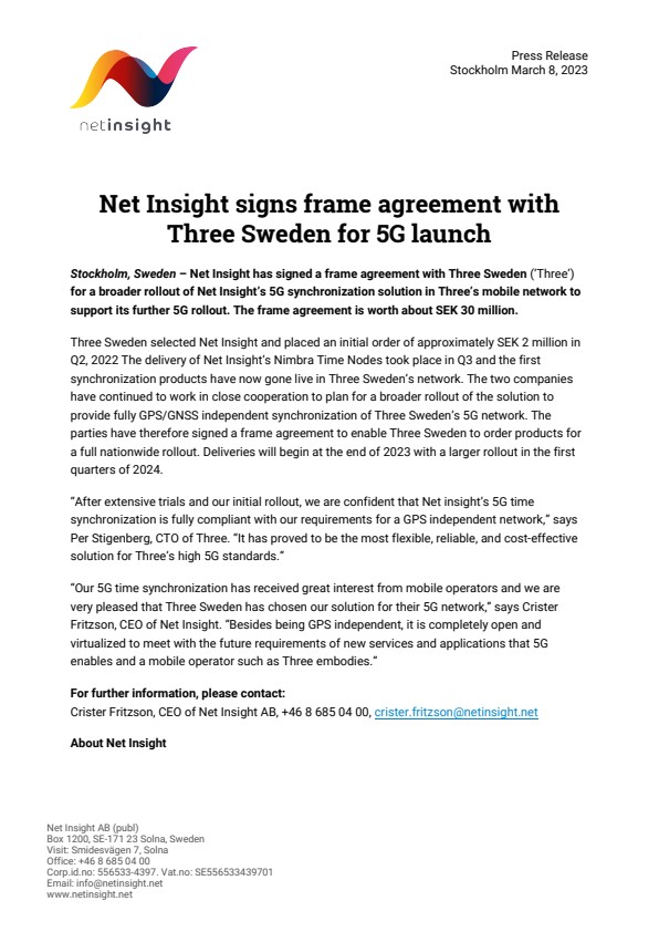 Three Sweden selected Net Insight and placed an initial order of approximately SEK 2 million in Q2, 2022 The delivery of Net Insight’s Nimbra Time Nodes took place in Q3 and the first synchronization products have now gone live in Three Sweden’s network. The two companies have continued to work in close cooperation to plan for a broader rollout of the solution to provide fully GPS/GNSS independent synchronization of Three Sweden’s 5G network. The parties have therefore signed a frame agreement to enable Three Sweden to order products for a full nationwide rollout. Deliveries will begin at the end of 2023 with a larger rollout in the first quarters of 2024.