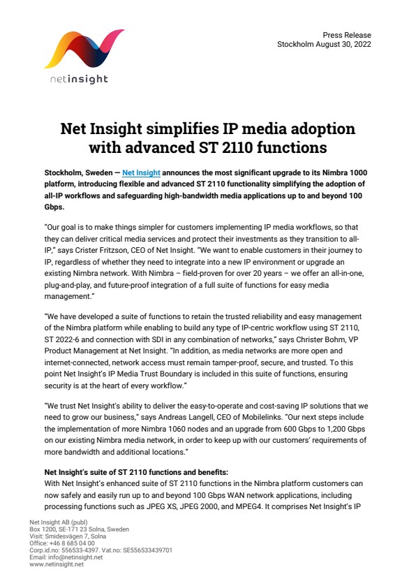 “We trust Net Insight's ability to deliver the easy-to-operate and cost-saving IP solutions that we need to grow our business,” says Andreas Langell, CEO of Mobilelinks. “Our next steps include the implementation of more Nimbra 1060 nodes and an upgrade from 600 Gbps to 1,200 Gbps on our existing Nimbra media network, in order to keep up with our customers’ requirements of more bandwidth and additional locations.”