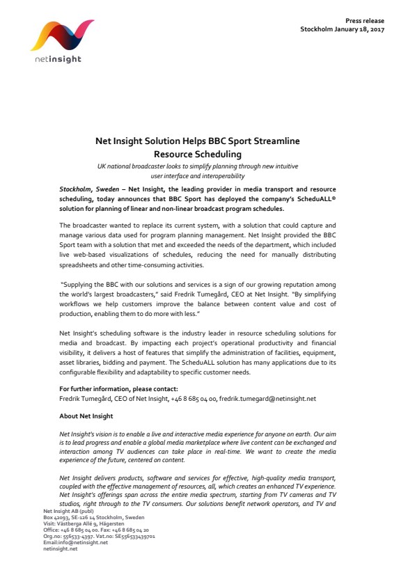 Stockholm, Sweden – Net Insight,the leading providerin media transport and resource scheduling, today announces that BBC Sport has deployed the company's ScheduALL® solution for planning of linear and non-linear broadcast program schedules.