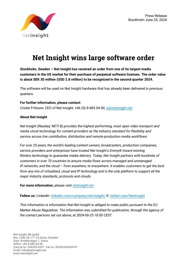 Stockholm, Sweden – Net Insight has received an order from one of its largest media customers in the US market for their purchase of perpetual software licenses. The order value is about SEK 30 million (USD 2.8 million) to be recognized in the second quarter 2024.