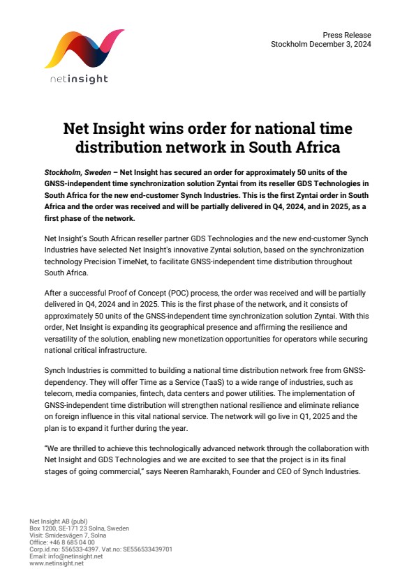 Stockholm, Sweden – Net Insight has secured an order for approximately 50 units of the GNSS-independent time synchronization solution Zyntai from its reseller GDS Technologies in South Africa for the new end-customer Synch Industries. This is the first Zyntai order in South Africa and the order was received and will be partially delivered in Q4, 2024, and in 2025, as a first phase of the network.