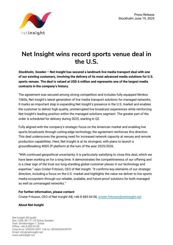 “With continued geopolitical uncertainty, it is particularly satisfying to close this deal, which we have been working on for a long time. It demonstrates the competitiveness of our offering and is a clear sign of the trust our long-standing global customer places in our technology and expertise.” says Crister Fritzson, CEO of Net Insight. “It confirms key elements of our strategic direction, including a focus on the U.S. market and highlights the value we deliver to live sports media ecosystem through our reliable, scalable, and future-proof solutions for both managed as well as unmanaged networks.”