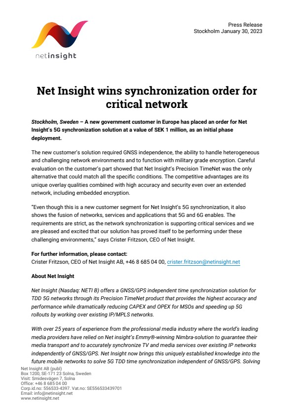 Crister Fritzson, CEO of Net Insight AB, +46 8 685 04 00, crister.fritzson@netinsight.net