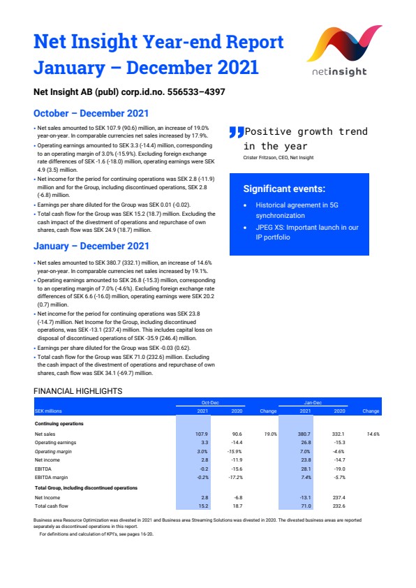 Crister Fritzson, CEO of Net Insight AB, +46 8 685 04 00, crister.fritzson@netinsight.net