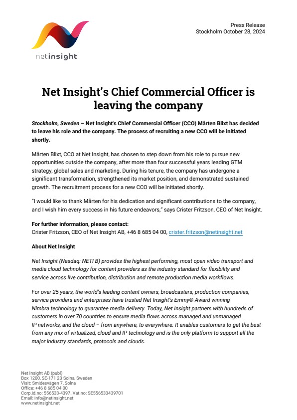 Stockholm, Sweden – Net Insight's Chief Commercial Officer (CCO) Mårten Blixt has decided to leave his role and the company. The process of recruiting a new CCO will be initiated shortly.