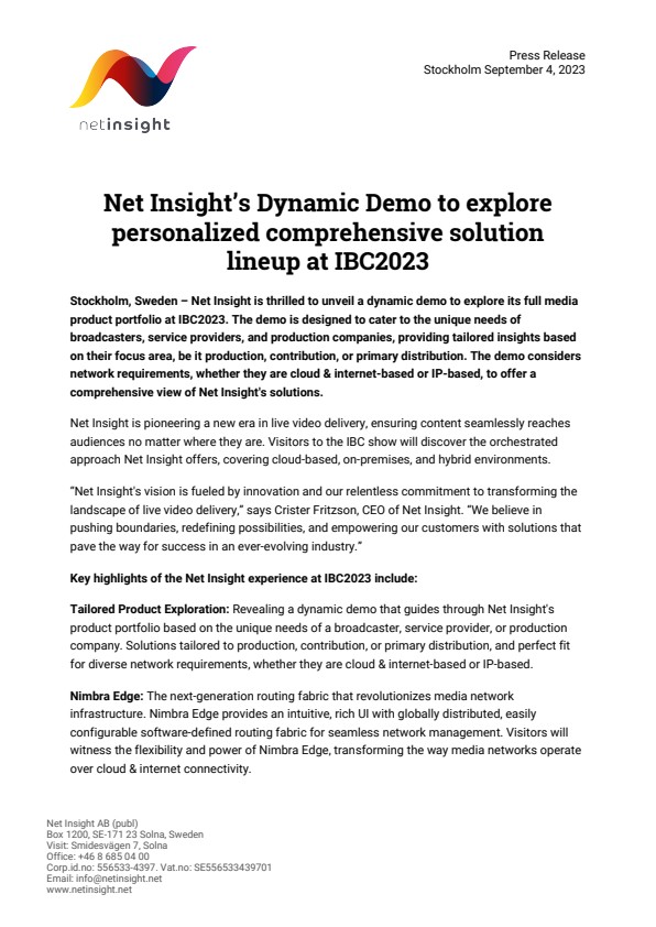 “Net Insight's vision is fueled by innovation and our relentless commitment to transforming the landscape of live video delivery,” says Crister Fritzson, CEO of Net Insight. “We believe in pushing boundaries, redefining possibilities, and empowering our customers with solutions that pave the way for success in an ever-evolving industry.”