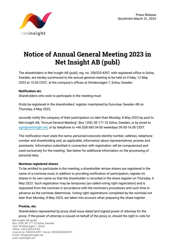 The shareholders in Net Insight AB (publ), reg. no. 556533-4397, with registered office in Solna, Sweden, are hereby summoned to the annual general meeting to be held on Friday, 12 May 2023 at 10.00 CEST, at the company's offices at Smidesvägen 7, Solna, Sweden.