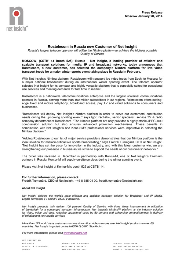MOSCOW, (CSTB' 14 Booth 525); Russia – Net Insight, a leading provider of efficient and scalable transport solutions for media, IP and broadcast networks, today announces that Rostelecom, a new customer, has selected the company's Nimbra platform for live video transport feeds for a major winter sports event taking place in Russia in February.