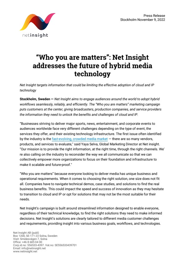Stockholm, Sweden — Net Insight aims to engage audiences around the world to adopt hybrid workflows seamlessly, reliably, and efficiently. The “Who you are matters” marketing campaign puts customers at the center, giving broadcasters, production companies, and service providers the information they need to unlock the benefits and challenges of cloud and IP.
