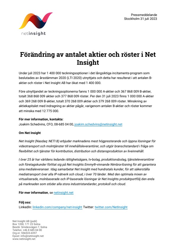 Under juli 2023 har 1 400 000 teckningsoptioner i det långsiktiga incitaments-program som beslutades av årsstämman 2020 (LTI 2020) utnyttjats och detta har resulterat i att antalen B-aktier och röster i Net Insight AB har ökat med 1 400 000.